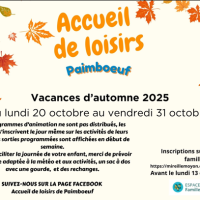 Voici la plaquette des vacances d’Automne pour l’Accueil de loisirs de Paimboeuf. Les inscriptions seront ouvertes via les espaces famille à partir de vendredi [+]